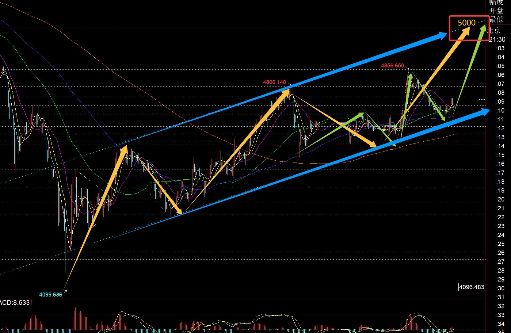 아무리 금값이 단기적으로 등락하고 단기적으로 이를 억제하더라도 최종 목적지는 변함이 없으며, 이는 사진에 표시된 빨간색 영역만 보아야 한다는 것입니다. 블루 채널의 하위 트랙이 유지되는 한 목표를 향해 발전할 것입니다. 잉크라면 2주 이내, 빠르면 1주일 이내; 노란색 파형과 녹색 파형 모두 아직 끌어올릴 다섯 번째 파동이 부족하므로 계속 기다리세요;