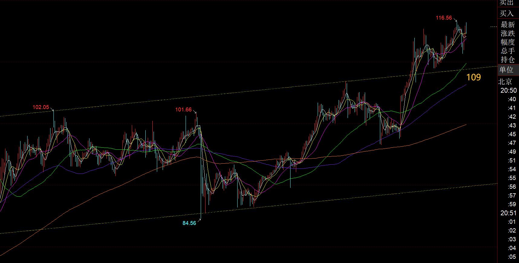 原油方面:昨日离黄色通道上轨回踩确认点位置108附近差一些,今日上移109附近,这里未有效跌破前,还是维持强势格局;小时线macd顶背离状态也逐步加重,119.5前高未突破之前,也谨防高位追北,多观察,靠近支撑附近再看信号;