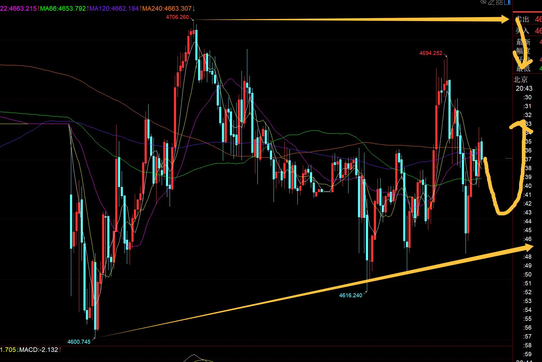 第二,黄金小时线级别:今日的走势就没昨日那么好找规律,同样是区间内震荡,昨日可以每次卡618分割位置都可以成功,而今日每一波卡618,都出现了不同程度的惯性杀,也就是洗盘;比如,早间4616低点触及后拉升至4663,那么回踩618是4635,惯性跌至4622才起来;比如欧盘从4622涨至4694,回踩618是4650,它惯性跌至4628才起来;短线基本要控制一定止损位,就容易被刺破,这也是比较恶心的一点;但若适当放开止损,以波段来试探,就可以规避短线的洗盘;接下来,关注4640-30支撑,4710-4700阻力,大概这个范围内继续整理,预计要磨到周尾,借助消息来进行突破;
