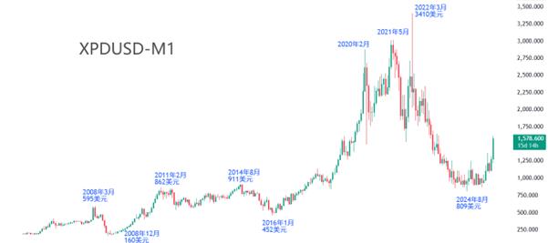 In den letzten 20 Jahren erlebte der Palladiumpreis sowohl rasante Höhen als auch schnelle Rückgänge. Obwohl der Palladiumpreis vor 2016 stieg und fiel, lag die Obergrenze nicht über 1.000 US-Dollar und die Untergrenze fiel nicht unter 150 US-Dollar. Nach 2016 begann Palladium einen Boom-Modus und erreichte im März 2022 einen Rekordpreis von 3.410 US-Dollar. Der Anstieg der Palladiumpreise in diesem Zeitraum war hauptsächlich auf das Fehlen einer effektiven Ausweitung der Produktion auf der Angebotsseite und die Verlagerung von Dieselfahrzeugen auf Benzinfahrzeuge auf der Nachfrageseite zurückzuführen, was zu einem Anstieg der Nachfrage nach Palladium für Katalysatoren führte.