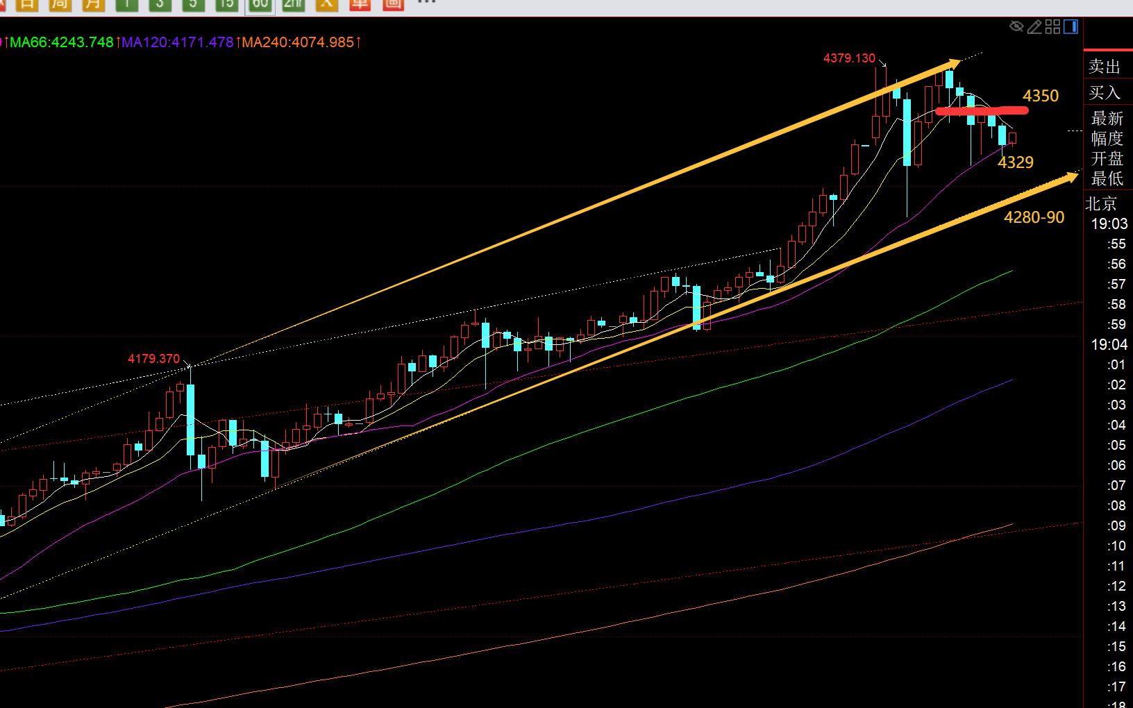 Drittens das goldene Stundenniveau: Aus dem Bild oben geht hervor, dass es sich derzeit im gelben aufsteigenden Kanal befindet, und der Die obere Schiene stand an der Linie 4380 zweimal unter Druck. Es gibt ein gewisses Doppelhoch, aber es muss morgens unter das Tief von 4280-90 fallen, um eine wirksame Unterdrückung des M-Kopfes zu erreichen; Allerdings befindet sich der europäische Markt in einer Phase kontinuierlicher Yin- und einzelner Yang-Schockrückgänge, und es gibt zu viele negative Linien, was darauf hindeutet, dass sich die nach unten gerichtete kinetische Energie ansammelt; Die wichtigste Unterstützung ist die mittlere Spur, die zu diesem Zeitpunkt bis 4329 steigt. Sobald das große Yin oder das kontinuierliche Yin die Position tatsächlich durchbricht, wird es im Grunde genommen weiterhin den Markt nach unten drücken; Wenn es das Intraday-Tief durchbricht, kann es schnell darauf hinweisen, dass der frühe Retracement-Punkt des 4220-First-Line-Kanals zufällig die Position des täglichen 5-Bewegungsdurchschnitts ist, und dann beobachten, ob er sich stabilisiert. Wenn die Tageslinie repariert wird, können die Marktaussichten mutig weiter nach Einbrüchen suchen und dem Trend folgen, um den Anstieg und Anstieg zu beobachten; wenn 4220 nicht halten kann, dann ist der Abwärtstrend 4162; Der Widerstand ist klar. Die Druckposition des Knotens beträgt 4350, was die Seitwärtsposition des europäischen Marktes und den Unterdrückungspunkt des 10-gleitenden Durchschnitts darstellt. Sollte es erneut zu einem Durchbruch kommen, kann es zu einem erneuten Anstieg kommen, der das Intraday-Hoch erreicht. Auch darauf müssen Sie vorbereitet sein; Kurz gesagt, seien Sie vorsichtig mit einer Welle von Marktkorrekturen heute Abend;
