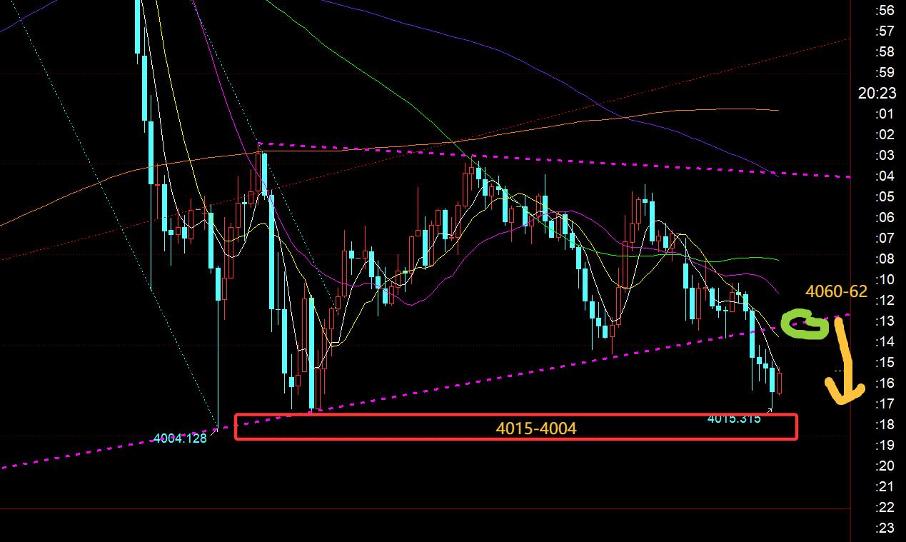 Viertens das goldene Stundenniveau: Aus dem Bild oben ist das untere Konvergenzdreieck heute auf dem europäischen Markt kontinuierlich zusammengebrochen. Dann wird es vor und nach dem US-Markt eine Erholung geben, die leicht Bullen anzieht. Es gibt einen zweiten Abwärtstrend. Achten Sie auf den Kanalgegendruckpunkt 4060, der kurzfristig unter Druck steht. Bärisch, die untere Unterstützung liegt bei 4015 und 4004. Wenn die 4000er-Marke verloren geht, achten Sie auf 3975, 3945 und die Grenze liegt bei 3914. Persönlich denke ich, dass der untere Raum nicht groß ist oder die Zeit nicht lange anhält. In 2 Stunden und 4 Stunden wird es unten sein. Aus der Sicht des Staates ist es leicht, den überverkauften Aufschwung durch einen Rückgang zu überraschen; Versuchen Sie daher, dem Rückgang nicht hinterherzujagen, bevor die Erholung eintritt. Wenn der Preis außerdem 4060 durchbricht, wieder steigt und zum Konvergenzdreieck zurückkehrt, wird er entweder den Konvergenzbereich erweitern und sich weiter konsolidieren oder sich langsam stabilisieren und nach oben bewegen. Sie können nicht blind pessimistisch sein; Wenn Sie also heute Abend zum zweiten Mal bärisch sind, darf der Schlusskurs nicht in das violette Dreieck im Diagramm zurückfallen. Wenn Sie auf einem niedrigen Niveau optimistisch sein möchten, müssen Sie warten, bis der zweite Rückgang abgeschlossen ist oder stabile Signale in der Nähe der genannten Unterstützungen vorliegen, bevor Sie darüber nachdenken;