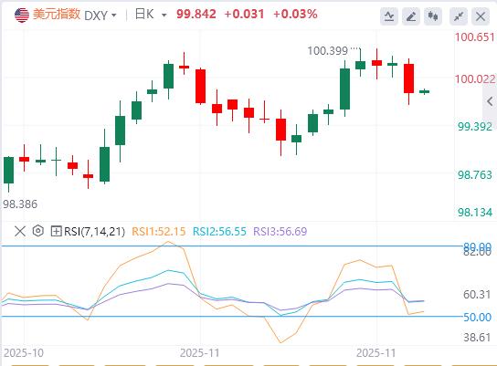 On November 26, in early trading in Asia on Wednesday, Beijing time, the U.S. dollar index was hovering around 99.84. On Tuesday, as lower-than-expected retail sales data strengthened market expectations for a December interest rate cut by the Federal Reserve, the U.S. dollar index fell back from its highs, falling below the 100 mark, and finally closed down 0.389% at 99.81; U.S. bond yields continued their decline, with the benchmark 10-year U.S. bond yield falling below 4% for the first time since late October, and the 2-year U.S. bond yield, which is sensitive to the Fed's policy interest rate, closed at 3.463%. As the prospect of an interest rate cut by the Federal Reserve was offset by the easing of geopolitical risks, spot gold fluctuated in a range, setting a new high since November 14, and finally closed down 0.1% at US$4,130.84 per ounce; spot silver finally closed up 0.24% at US$51.48 per ounce. International crude oil returned to decline as signs of progress in Russia-Ukraine peace talks boosted expectations that Russian oil supplies will remain stable. WTI crude oil once fell 3%, approaching the US$57 mark, hitting a new low in more than a month. It finally closed down 1.36%, at US$58.09/barrel; Brent crude oil finally closed down 1.31%, at US$61.97/barrel.