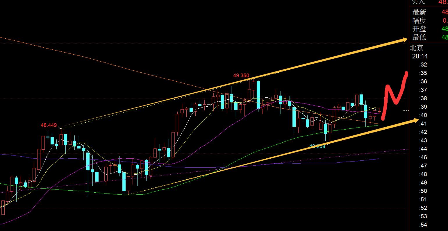 Deuxièmement, en termes d'argent : pour l'argent, le niveau quotidien est la suppression à mi-parcours de 49,45, et le support de résonance sur le Les 5ème et 10ème sont à 48,2, donc également en pleine secousse ; sur l'image ci-dessus, il y a aussi un canal jaune vers le haut, et la piste inférieure prend en charge ce soirFaites attention à 48,5-48,6, le rail médian horaire a également percé et la tendance est similaire à celle de l'or. Il a tendance à stabiliser le rail intermédiaire et à rebondir vers le haut, puis à se précipiter plus haut et à retomber, grinçant lentement dans le canal ascendant ;