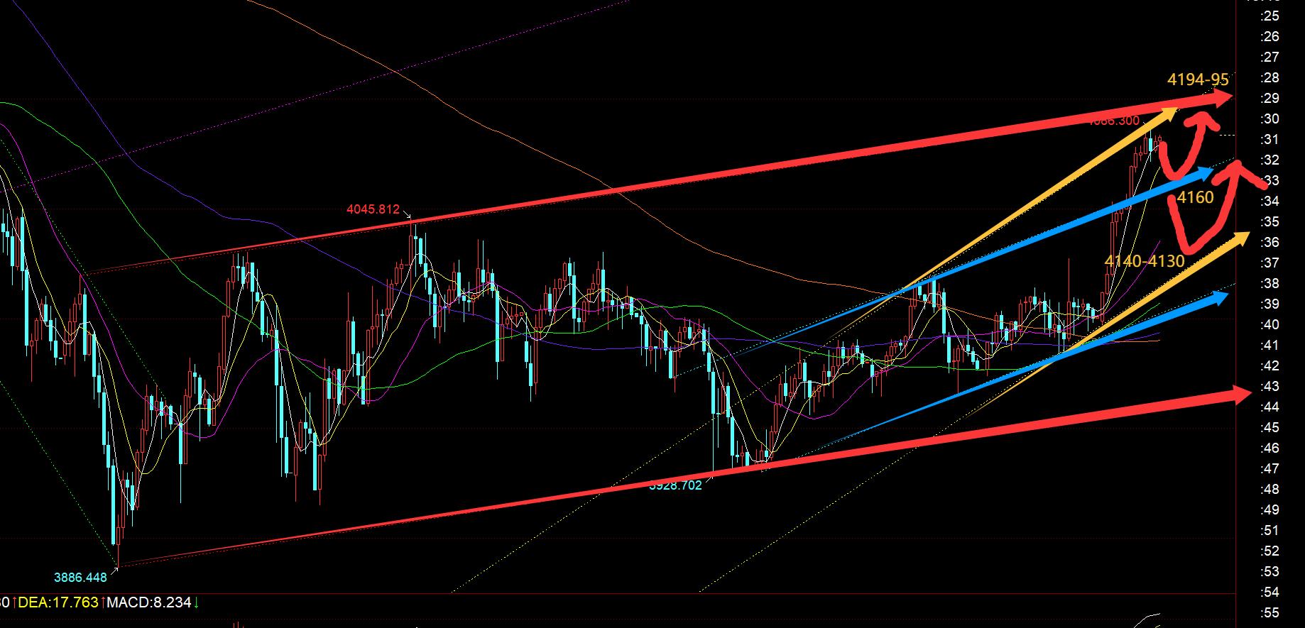 Deuxièmement, le niveau quotidien doré : il y a actuellement un grand soleil, impactant la ligne médiane 4078, et la pression parallèle du triangle ascendant inférieur mentionnée dans la vidéo de Zhou autour de 4040 est plus critique. , si la clôture d'aujourd'hui peut permettre au Yangyuan de se maintenir au-dessus de cette position ou de la ligne Yang pendant deux jours consécutifs, alors la faible consolidation en bas a vraiment pris fin. D’ici là, ce ne sera plus qu’une question de temps pour attendre que le rail intermédiaire soit percé et se redresse. Il y aura une forte probabilité d’au moins un deuxième sommet cette semaine. Nous prêtons toujours attention à la position de division 618 de 4192, suivie de la position de division 786 de 4275. Quant à savoir si elle peut atteindre directement un nouveau sommet historique, ne la forcez pas, étape par étape ; la tendance idéale est similaire au 8 avril, le niveau élevé subira une longue période de consolidation du triangle de convergence. L'année prochaine, le marché haussier continuera d'atteindre 5415, le prochain niveau d'expansion dérivé de la troisième vague mensuelle ;