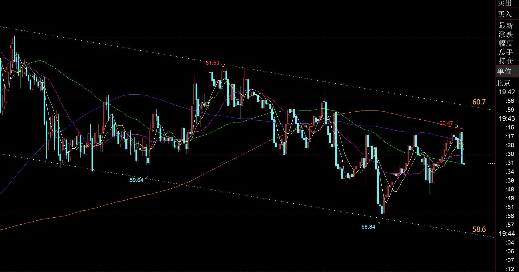 Pétrole brut : il n'y a pas de grandes fluctuations. Nous continuerons à traiter les fluctuations dans le petit canal jaune. La résistance du rail supérieur est de 60,7 et le support du rail inférieur est de 60,7. 58.6;