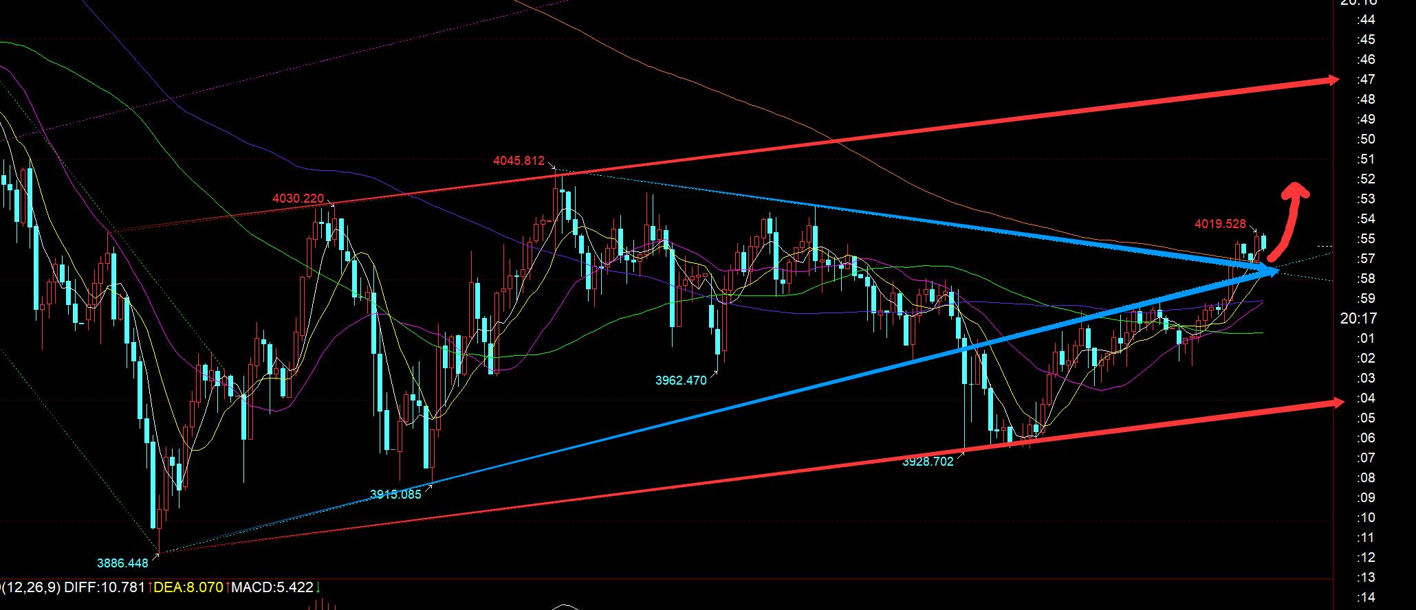 Terzo, il livello orario dorato: la resistenza alla contropressione della rotaia inferiore del triangolo blu di convergenza di 3990 è stata ancora soppressa durante la notte. Al mattino si è verificata un'ondata di ribasso, scendendo al di sotto della linea mediana e della linea di tendenza che collega il minimo mattutino di ieri e il minimo del mercato europeo. Tuttavia, non ha continuato a diminuire, ma ha continuato a salire fino in fondo. Durante il mercato europeo, ha persino sfondato l'importante livello di resistenza di 3990, ha sfondato il livello di resistenza del triangolo di convergenza e ha sfondato anche in questo momento. La media mobile annuale è soppressa, quindi segui il mercato stasera e continua ad essere rialzista. Il supporto attuale è superiore a 4004-06. Fondamentalmente, finché viene mantenuta la soglia dei 4000, c'è un'alta probabilità che il rimbalzo continui a salire. La resistenza è 4030 e 4050. La forte pressione è la traccia superiore del canale rosso a 4080. Solo superando il punto di soppressione della traccia superiore del canale rosso possiamo rafforzarci a breve termine e raggiungere un massimo secondario;
