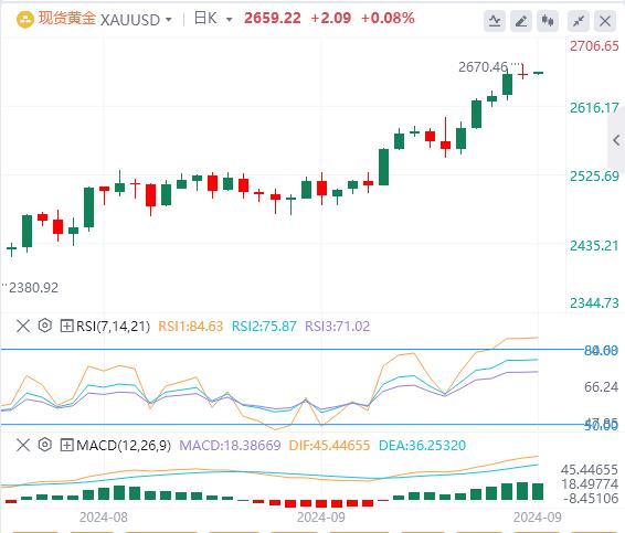 周四亚盘,黄金交投于2659.22附近。金价周三连续第二个交易日稳稳保持在2,650美元上方,因为交易员增加了美联储(Fed)在即将到来的11月会议上再次大幅降息的可能性。这一点以及美国国债收益率高企阻止了黄金/美元进一步上涨,大部分交易价格接近2,660美元,上涨0.14%。由于华尔街交易处于亏损状态,市场情绪在美国时段略有恶化。因此,金价创下2,670美元的历史新高,但随着美国国债收益率上涨4.5个基点(bps)至3.775%而回落。