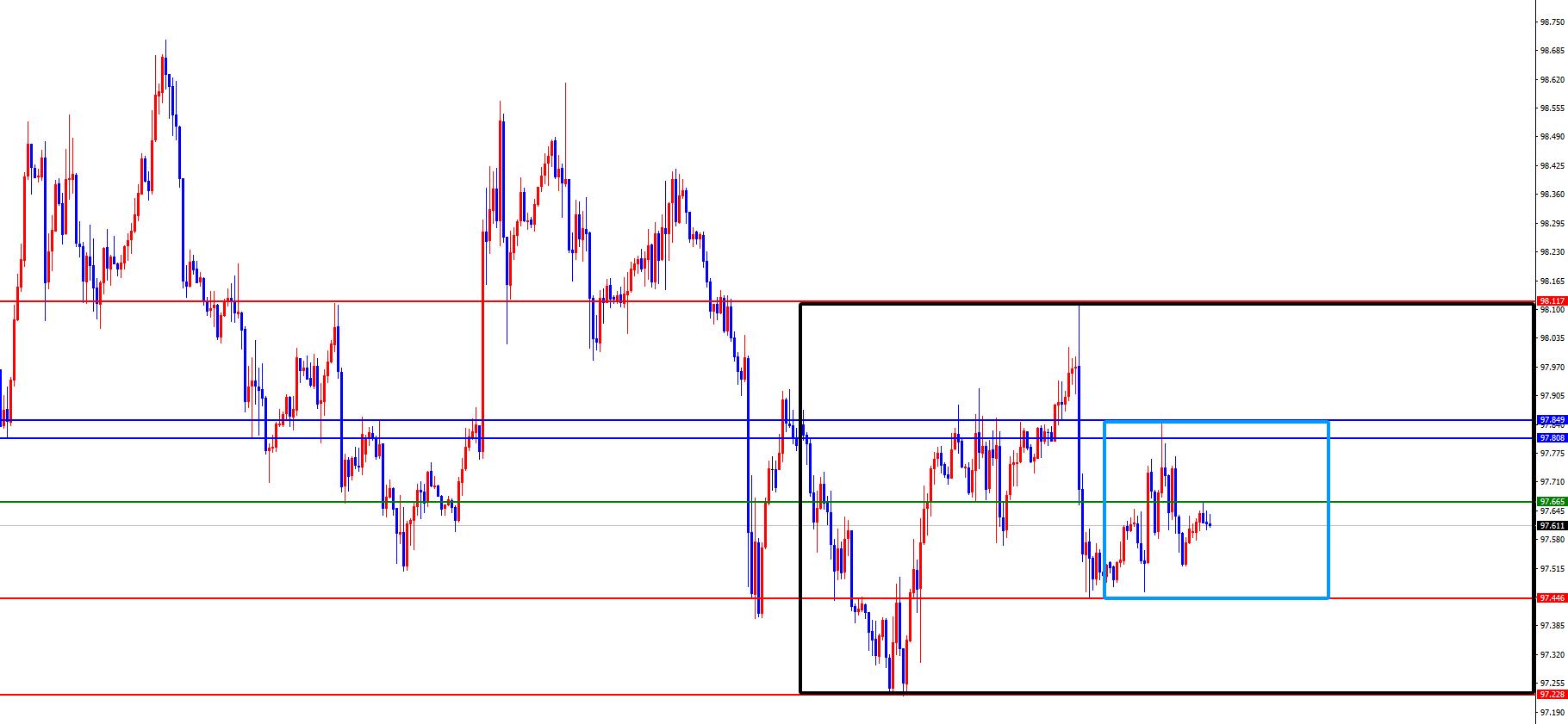 o alcance do índice dos EUA 97.25-98.10, a pequena faixa era 97,45-97,85, e a bacia hidrográfica era 97,66