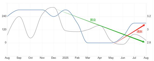Powell's meaning is clear: the Federal Reserve is facing a dilemma, interest rate cuts may lead to high inflation, and non-rate cuts may lead to unemployment waves. A imagem acima mostra a taxa anual de CPI Core nos Estados Unidos e os novos empregos não agrícolasO gráfico de sobreposição dos dados orais mostra que a inflação ainda está se recuperando, enquanto a população de emprego não agrícola continua a diminuir. O valor mais recente da taxa de inflação central é de 3,1%, que ainda está acima do padrão de inflação moderado de 2%. O número de novos empregos não agrícolas caiu acentuadamente para 22.000, muito menor que o pico de 323.000 no ano passado. Embora o Fed tenha reiniciado os cortes na taxa de juros em setembro, se as taxas de inflação aumentarem significativamente nos próximos meses, pode não ser possível continuar a reduzir as taxas de juros em novembro e dezembro deste ano.