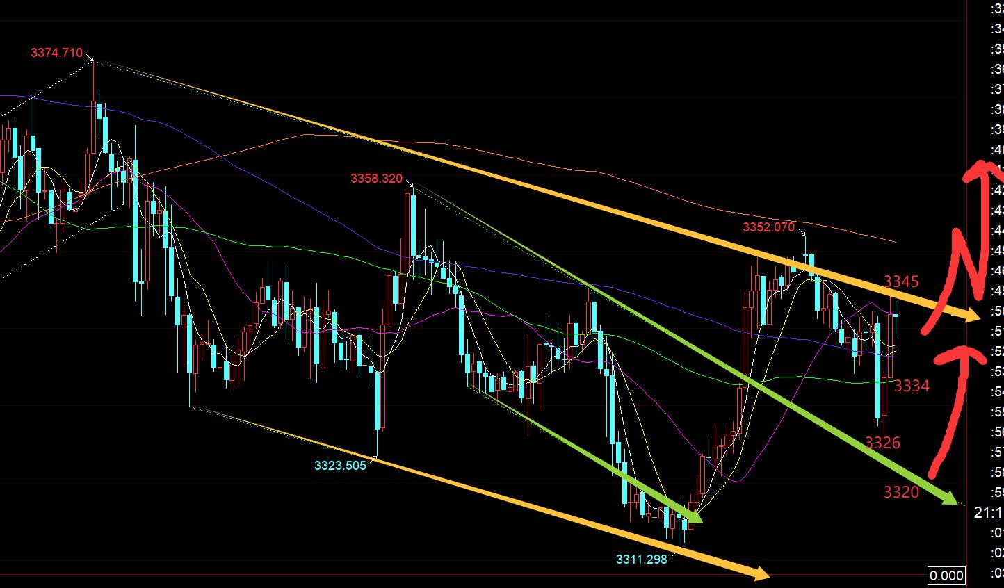 第二,黃金小時線級別:隔夜持續拉升,今日早間給出的短期看漲位置是兩個,一個是凌晨低點3338,一個是3334日線5均線位置,然而觸及之後,歐盤18點之前只是小幅緩慢反彈,並非有力度;我們知道,只有歐盤強勢,最好突破早間或隔夜高點,美盤才能更好的二次上拉;歐盤不強,就可能存在再次震盪,因此3338提示調倉,之後19點出現一根大陰,完全規避了洗盤風險;而殺跌之後,提示的支撐是關注3326-3323之間企穩,因為3326是昨日漲幅618分割位置,3323是前期一波漲幅618分割位置,也是圖中綠色通道回踩上軌確認支撐點;由於是歐盤剛大陰下來,也不急於馬上佈局,想著它會小範圍震盪下,等美盤企穩再發力,沒想到美盤還沒到,就直接一個V洗回去了,那就錯失了低位;那麼接下來,按照圖中通道分佈,可以知道3345一線是通道反壓,這裡未突破站上之前,先不急於追漲,今晚第一支撐又回到3334日線5均線,極限就是3320之上,靠近綠色通道上軌,觸及出企穩繼續看漲;或者3345強勢突破站上之前,回踩確認跟隨看漲,阻力目標上方還是繼續關注3358-60、3371-75等;