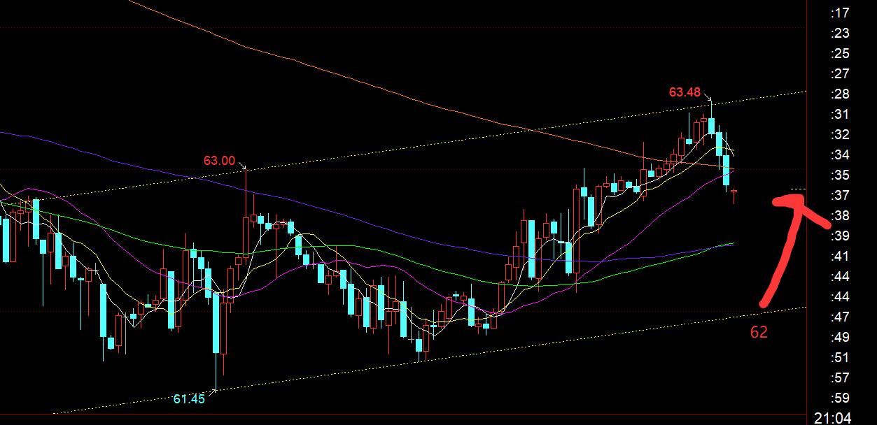 原油方面:日線10均線壓制還在,還未有效突破,仍不宜追漲,同時上圖通道上軌剛好日內壓制下滑,今晚關注62下軌支撐,觸及企穩看反彈;上軌63.5一線二次先拉升壓制不過,看回落,震盪對待;原油被一路壓制下滑太久時間,還未出現過好的超跌反彈修正,因此傾向於等拉低看漲反彈;