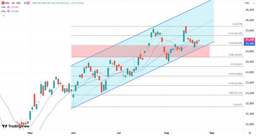 恆指自上週以來呈現回落的趨勢,部分跟隨外圍的觀望情緒,近幾日窄幅交投在日圖均線範圍,當前週線暫時錄得輕微跌幅,日內收盤是否高於該位成為下週能否打破沉默的關鍵,如果重啟反彈,會以25400至25800範圍為目標,尤其是彌補8月中旬缺口的情況下。但如果跌破均線,則關注上行通道底部有望捍衛25000關口。