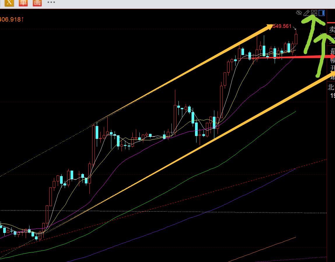 今日5均線支撐上移3480的上方,離此時的價格有70米距離,一旦距離越大,接近百米或更高,就要時刻小心衝高回落來急速修正,當然這不代表你可以去逆勢空,作為單邊強勢趨勢拉升中,一定記住只多不空原則不變,放棄抓回調,任何有抓回調的想法出現,結局基本是兩頭被打;此時逼近3550關口,再去追多風險也逐步加大,就耐心等待它出現回調下跌,企穩再繼續看漲即可,只要一直維持短期5日,極限10日,就一路保持趨勢單邊看漲;