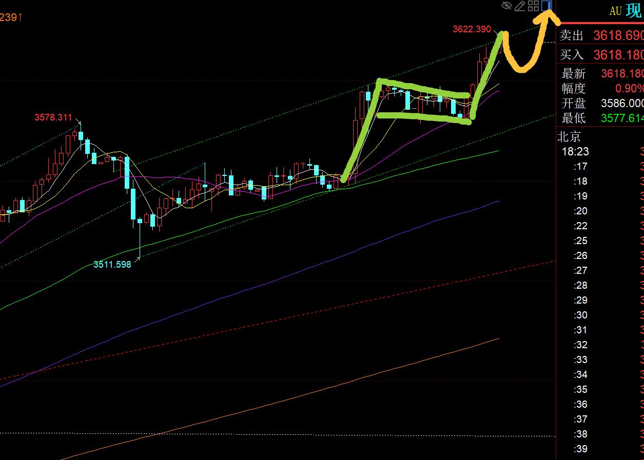 第四,黃金小時線級別:隔夜強勢破高至3600繼續走強,那麼今日早間先回測就應該繼續去跟隨這一波漲勢;而作為單邊強勢來講,一般回踩最多50分割位置,大部分382分割位置就會企穩;今日早間回踩的低點3578剛好是382分割點,然後又是出現一路橫盤,強勢中橫盤不跌是通過時間來修復一定的背離和超買,等靠攏小時線中軌就基本是一個首要試探看漲的支撐點,因此午後3580一線觸及到位,是可以先去嘗試繼續看漲,若還有低位去50分割點,再繼續補一些即可;單邊強勢多頭拉升格局下,不要恐高,也沒必要恐高,因為都是順勢,而順勢往往都容易發力;只要你心中一直堅信多頭趨勢,堅信單邊上漲,你就不會恐高,看到回踩了眼裡就是錢的光;相反,但凡你心中有空的想法,或臆想,是不敢高位去跟隨看漲的,只會一步又一步的踏空,反而去不斷試探高空,不斷被打出局,這就是節奏和方向的問題;午後3580跟隨看漲之後,歐盤成功拉升,突破3600站上進一步發力,一下子3610到位,30米空間可以把握的,此時又沖值3622高度,勢頭非常猛,繼續只多不空原則,耐心等今晚美盤前後出現誘空來把握二次看漲點;首要支撐則是頂底位置3600一線,也是靠攏中軌上移點,再結合3580-3622這一波分割來看,3606、3601、3595都有支撐(前提是假設3622暫時承壓進行回落修正),所以回踩確認它們,以中軸3600上下作為支撐節點,擇機繼續二次看漲,目標可以反复看新高,按照上升旗形等同漲幅來看,有望指向3630一線;