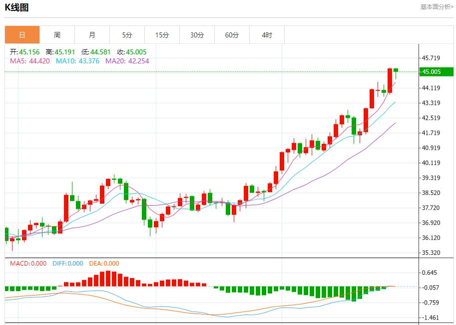 現貨白銀:截止北京時間20:23,現貨白銀下跌,現報45.001,跌幅0.34%。紐市盤前,儘管在相對強度指標上出現了負面信號,但在達到超買水平(表明積極勢頭的強度)後,白銀價格在最後一個交易日上漲,在44.75美元的當前阻力位上方結算,以確認突破該阻力位為近期的新阻力位開闢了道路,在短期內主要看漲趨勢占主導地位,並沿著該軌道的支撐趨勢線交易。
