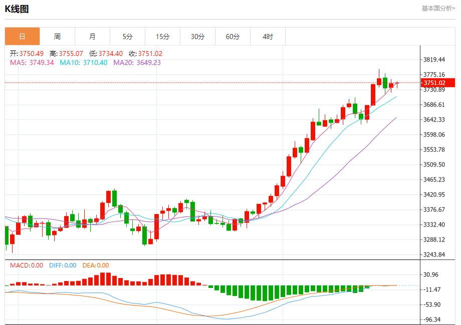 現貨黃金:截止北京時間20:23,現貨黃金上漲,現報3751.10,漲幅0.05%。紐市盤前,(黃金)價格在最後一個盤中交易中繼續試圖獲得看漲勢頭,利用其在EMA50上方交易所代表的動態支撐,除了相對強度指標上出現積極信號之外,在其沿趨勢線交易中,加強了短期主要看漲趨勢的主導地位。